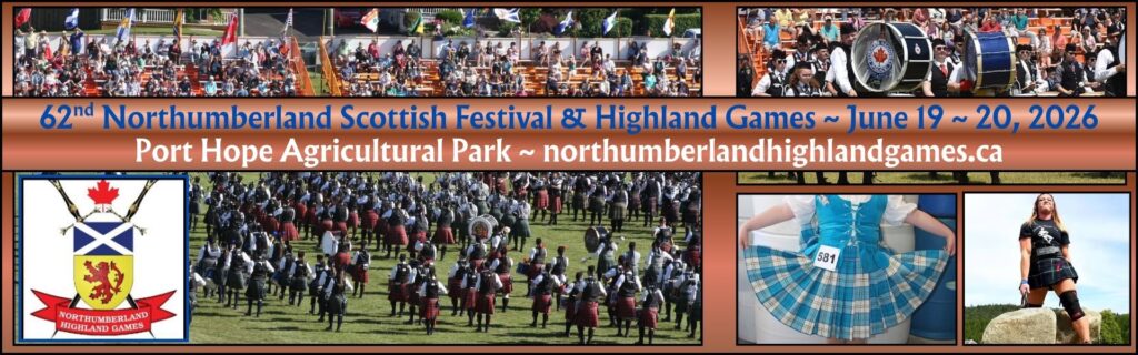 The Cobourg Highland Games Society Presents the 62nd Northumberland Scottish Festival and Highland Games is held at the Port Hope Agricultural Park on the third Saturday in June.